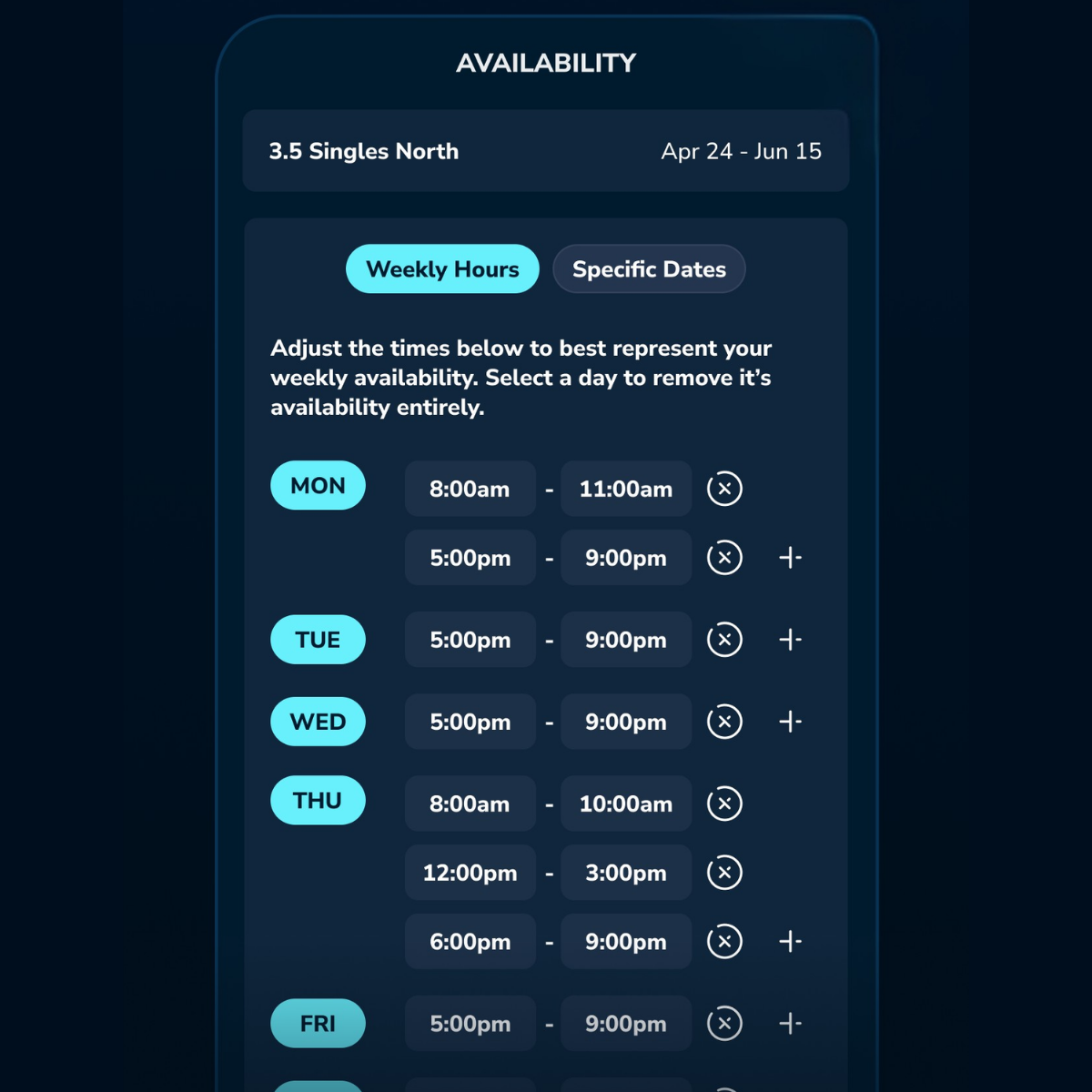 You'll see all of your opponents on the first day of the season. Each match has a weekly deadline. You coordinate directly with your opponent using our built-in scheduling and availability tools. You can play ahead, reschedule for rain, or recruit a sub if life gets in the way. The league is built to flex around real life.