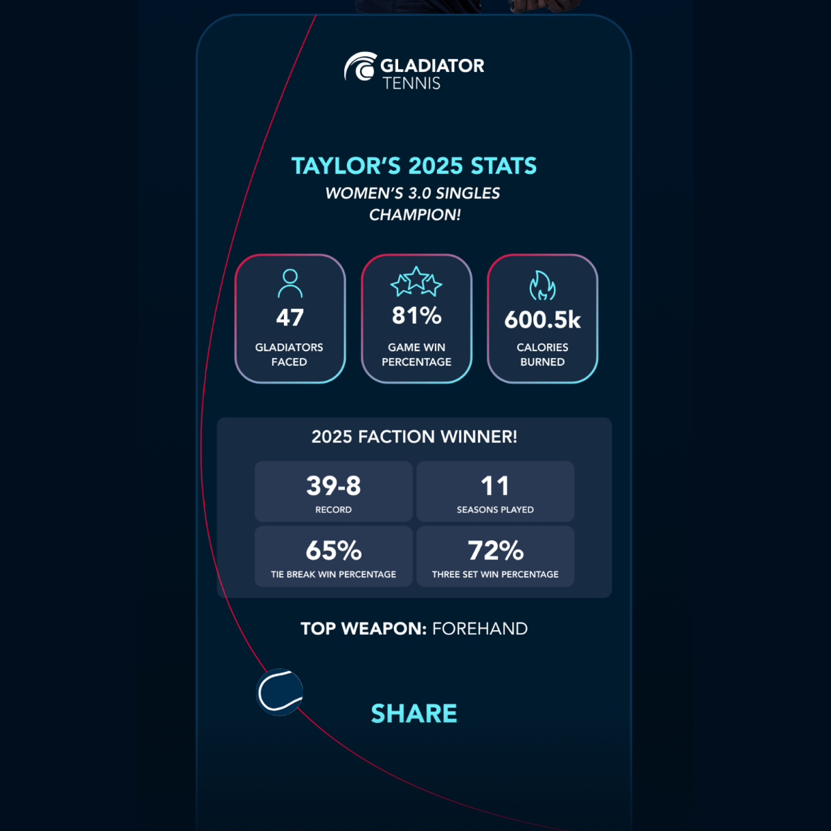 "I picked up a racket for the first time at the age of 42, a friend suggested I try Gladiator so that I could play against similar-level players. It was a low-risk, high-reward situation for me. I credit Gladiator with turning this newbie into a tennis-obsessed player."